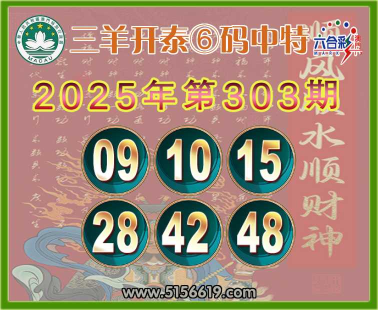 303期: 三羊开泰 ⑥码中特⚽【09.10.15.28.42.48】开:15